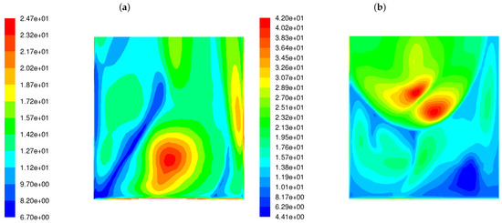 Figure 2 shows the distribution of the horizontal component of the velocity vector for HSBs (Figure 2a) and LSBs (Figure 2b). In the figure displaying the flow predictions for the HSB (Figure 2a), the backflow areas near the burner outlet are clearly visible; these are represented by the negative values of a horizontal component of the velocity vector. The simulation results indicate a short outlet gas flow, which is further dispersed due to strong turbulence. In the case of the LS burner type (Figure 2b), there are no backflows around the burners and the gas outflow range is larger. The high-velocity gas streams deeply penetrate the combustion chamber.