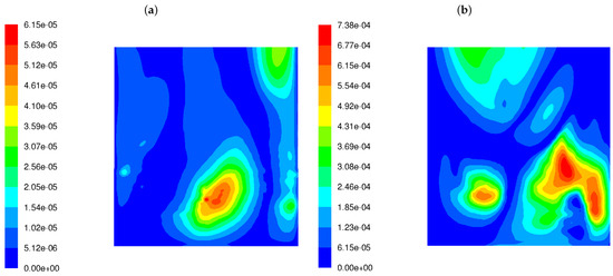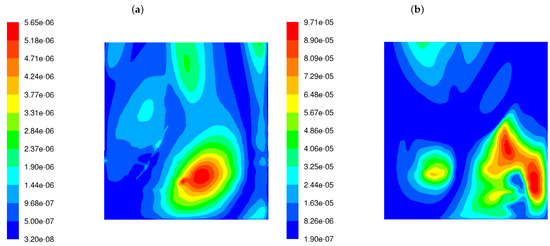 Our analysis involved the distributions of various flow and chemical parameters at a distance of 5 cm from the rear wall across the boiler width, between 8 m and 18 m of the boiler height. The frequency of velocity field fluctuations takes into account the dynamics of the process (changes in the fluid velocity field), as well as another parameter called mixture fraction variance () that shows the dynamics of the chemical compounds’ concentration. Since simplified geometry does not reflect the original tube walls of the boiler, it was decided to present the flow parameters at a distance of 5 cm from the external walls (as the diameter of the heating exchanger pipes is 10 cm). Those parameters are involved in the proposed parameter (see Equation (11)). Velocity fluctuation refers to the variations in velocity from its average or mean value over time or space. In turbulence, fluid particles move in random, chaotic patterns, causing rapid changes in velocity. Thus, velocity fluctuations are important for understanding how energy is distributed in turbulent systems. Higher velocity fluctuations are typically associated with more intense turbulence. When velocity fluctuations are high, it means the flow is highly unstable, with eddies, swirls, and rapid changes in the direction and magnitude of the velocity. High turbulence intensity can increase the mixing and transport of heat, mass, and momentum, which is very important in reactive flows. Figure 3 shows the distributions of magnitudes in the wall area near the left and rear tube screens for the HS and LS burners. The difference in the frequency level of velocity fluctuations is visible. The higher level of in the case of the LS burner means that the mixing process is not only more dynamic but also influences the other (in comparison to HS burner) chemical species concentration. In the high-swirl case, the maximum frequency is 24.7 1/s, while in the low-swirl case, it increases significantly to 42 1/s. It should be emphasized that the levels and scales of turbulence at the outlet of the burners were assumed to be the same.