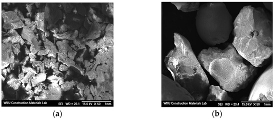Table 1 and Table 2 list the chemical composition of the binder and the physical properties of the fine aggregate used in this study. Table 3 lists the chemical composition of FSA measured by energy-dispersive X-ray spectroscopy (EDS). Notably, its composition comprises Si, Mg, Al, and Fe. Figure 1 and Figure 2 show the shapes and SEM images of NSA and FSA, respectively.
