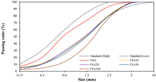Figure 3 shows the particle size distribution curves of the fine aggregates. The figure shows that FSA100, which solely used FSA, exceeds the standard particle size distribution curve range. However, the mixed fine aggregates (FSA10, FSA20, and FSA30), substituting 10, 20, and 30% FSA for NSA, conform to the standard particle size distribution curve range.