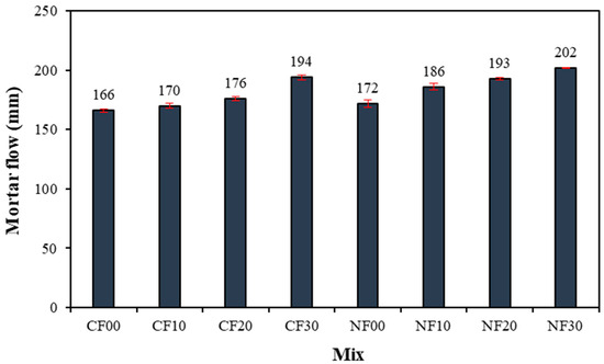 Figure 5 shows the flow change in GGBFS–based alkali-activated mortar using FSA. In particular, the flow of the CF00 sample with 2.5% CaO and 0% FSA was the lowest at approximately 166 mm. Moreover, as the amount of FSA increased, the mortar flow increased. The flow of the alkali-activated sample using FSA was approximately 2.4–16.8% higher than that in the CF00 sample. Note that even for the samples prepared with 2.5% Na2SiO3, the mortar flow increased with increasing FSA content. As shown in Table 2, the absorption rate of FSA is approximately 0.6%, which is lower than that of NSA (1.0%); therefore, the remaining excess water is assumed to increase mortar flow [22].