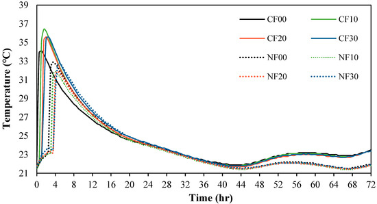 - The maximum temperature of CF10, CF20, and CF30 samples containing FSA was between 35.4 and 36.4 °C, which was between 3.8% and 6.7% higher than that of the CF00 sample. Moreover, the time to reach the maximum temperature for the CaO and Na2SiO3 samples tended to be slightly delayed as the FSA content increased.