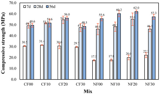 The 28 d compressive strength of the sample with Na2SiO3 showed a higher increasing rate than that of the sample with CaO. This is because the internal structure becomes denser with age due to the formation of N–A–S–H gel by the reaction of Ca, Al, and Si. [26,27,28,29,30]. Additionally, the relatively low compressive strength of the sample with 30% FSA was owing to a reduced packing effect due to the large particles of FSA. This trend is similar to that reported in previous studies [31,32] where the compressive strength decreased when the FSA content exceeded 25%. Moreover, this trend continued after 56 d where compressive strengths of the CF20 and NF20 samples with 20% FSA were relatively high at approximately 56.0 and 62.0 MPa, respectively. In addition, the 56 d compressive strength of the sample with Na2SiO3 was approximately 10.7–18.1% higher than that of the sample with CaO at the same FSA content.