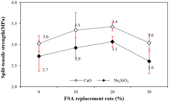 Similar to the compressive strength trend, the tensile strength increased when the amount of FSA increased to 20%, and the tensile strength of the sample with 30% FSA decreased. That is, the tensile strength of the sample with 20% FSA was 3.4 (sample with CaO) and 3.1 MPa (sample with Na2SiO3), which was approximately 13.3–14.8% higher than that of the sample with 0% FSA.