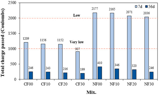 - After 7 d, the total charge passing through the sample with Na2SiO3 was approximately 1.79 to 2.24 times higher than that of the sample with CaO. Moreover, the total charge decreased when the amount of FSA increased. In particular, the total charge of the CF30 sample using 30% FSA was approximately 907 C, corresponding to a “very low” value according to ASTM C 1202. After 56 d, the total charge values of all samples decreased significantly.
