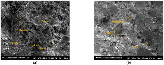 Singh et al. [10] examined the microstructures of geopolymer mortars using 2M and 12M alkali activators. The study result indicated that the sample with a 2M concentration showed a dense matrix, whereas the sample using a 12M concentration had voids containing unreacted activators due to excessive alkaline activators. Moreover, the compressive strength of the sample with the 12M concentration was lower than that of the sample with the 2M concentration. Rocha et al. [11] reviewed the properties of metakaolin-based geopolymer mortars fabricated using various alkaline activators. In particular, a matrix with many voids was observed in samples with sodium silicate, and a matrix with high density and few voids was observed in samples with potassium silicate.