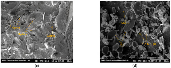 Figure 10 shows the SEM images of samples after 28 d. Notably, microcracks and hydrates can be observed in the CF00 sample with CaO and 0% FSA. Furthermore, the CF20 sample with 20% FSA presents fewer cracks and a denser surface than the CF00 sample. Because of this microstructure, the compressive and tensile strengths of the CF20 sample were higher than those of the CF00 sample. For samples with Na2SiO3, cracks are observed in the NF00 sample without FSA, and N–A–S–H gel hydrate with a dense surface is observed in the NF20 sample with 20% FSA.