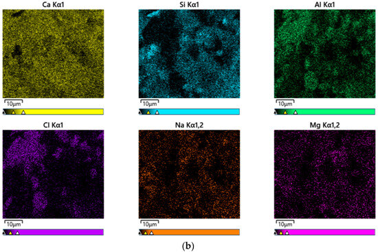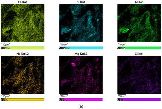 Figure 11 shows EDS mapping results for the CF20 and NF20 samples prepared with 20% FSA. Notably, both samples comprise similar elements, such as Ca, Si, Al, Cl, Na, and Mg, regardless of the type of alkaline activator. This result might be because, as described by Li et al. [39], the constituent elements of the alkali-activated composites are more influenced by the type of binder used than by the type of alkaline activator used.