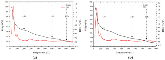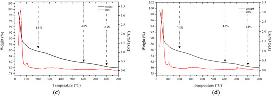 Figure 12 shows the TGA results for some samples after 28 d. Mass loss occurring in three stages is generally observed during TGA [40,41]. In the first stage, in a temperature range of 50–200 °C, the bound water and moisture contained in the C–(A)–S–H gel evaporates, and in the second stage, which spans from 200 to 600 °C, mass loss occurs due to thermal decomposition of the hydrate. In addition, the third stage loss that occurs in the range of 600 to 800 °C is caused by the decomposition of calcium carbonate at high temperatures.