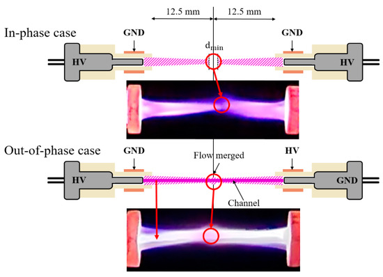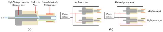 Schematics of (a) the plasma jet device and (b) in-phase and out-of-phase cases.