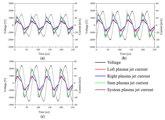 Figure 3 presents the voltage–current waveforms when the voltages of 1.5, 2, and 2.5 kV are applied to the two plasma jets. The voltage was measured across the entire system using a high-voltage probe connected to an oscilloscope, as shown in Figure 2b. Frequency was fixed at 16 kHz for all cases. The current waveforms were measured using a current monitor connected to an oscilloscope, as illustrated in Figure 2b. As shown in Figure 1b, the red line represents the current measured from the left plasma jet, while the blue line represents the current measured from the right plasma jet. The green line shows the combined current from both the left and right plasma jets, and the purple line represents the current measured across the entire system.