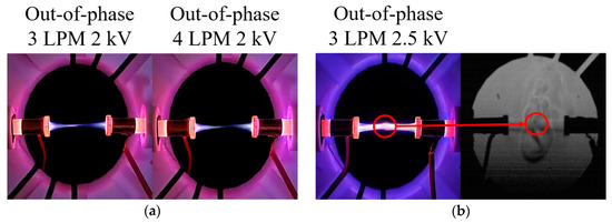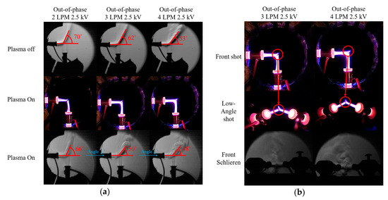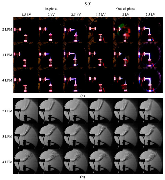Out-of-phase case (a) 3, 4 LPM 2 kV digital camera images and (b) 3 LPM 2.5 kV digital camera image and Schlieren image positioned 180°.