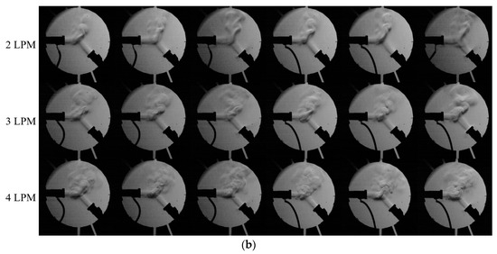 Figure 5a shows the effect of the gas flow rate on the interaction angle of the two jets for the out-of-phase case at 0 kV (plasma off, top) and 2.5 kV (plasma on, middle, and bottom). Unlike the case at 2 LPM, where no merging occurred, two plasma plumes merge at 3 or 4 LPM, as shown in Figure 4. Schlieren images revealed that the collision angle between the flows generated by the two plasma jets decreased from approximately 70° to 53° in the plasma-off case and from approximately 66° to 48° in the plasma-on case. The measurement uncertainty was ±6°. In the plasma-off case, the angle decreased linearly, while in the plasma-on case, there was a significant difference in the angle reduction before and after plume merging. This indicates that plume merging occurs as the collision angle between the two flows decreases, and angle reduction is influenced by both flow rate and plasma presence. Although not detailed in this paper, it was also observed that plume merging can occur in the 2 LPM case when external fluctuations are present, causing the two plasma plumes to connect.