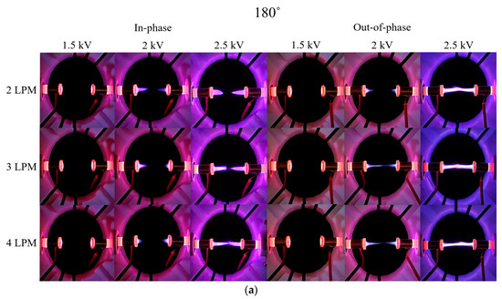 Figure 6 presents Schlieren and digital camera images of the in-phase and out-of-phase cases for two plasma jets positioned at a 135° angle. For the in-phase case, at 2.5 kV compared with 2 kV, the plasma plume length appeared shorter but exhibited stronger light intensity. Although an increase in voltage would typically result in a longer plasma plume, the observed decreasing length was attributed to the electrical repulsion between the plumes in the central region between the two plasma jets. Additionally, at 2 kV for the out-of-phase case, the plasma plumes at 3 and 4 LPM started to merge, unlike the 90° out-of-phase case shown in Figure 4a. When 2.5 kV was applied, the two plasma plumes merged but did not rise upward, in contrast to the behavior observed in the 90° out-of-phase case.