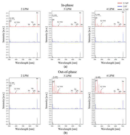Emission spectra of (a) in-phase and (b) out-of-phase cases for the variations of the gas flow rates (2, 3, and 4 LPM) and the applied voltage (1.5, 2, and 2.5 kV).