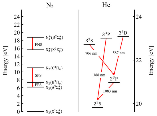 Figure 12 illustrates the SPS, FNS, and He energy states [37,38,39,40,41,42]. The SPS results from electron impact excitation by Equation (1), while the FNS is caused by Penning ionization by Equation (2) and electron impact ionization by Equation (3) [43,44,45,46].