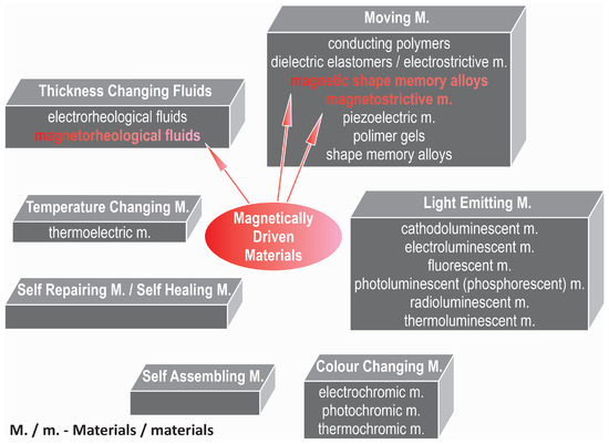 In Figure 1, the aforementioned groups of materials are presented, with a particular focus on those of interest to the author—specifically, magnetically driven materials, such as magnetic shape memory alloys (MSMA) and magnetorheological (MR) fluids.