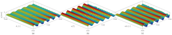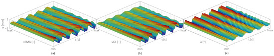 Figure 5 presents the transverse displacement (q) as a function of changes in the MSM actuator’s excitation amplitude —Figure 5a; the MSM actuator’s excitation frequency —Figure 5b; and the MSM actuator’s phase angle pa—Figure 5c.