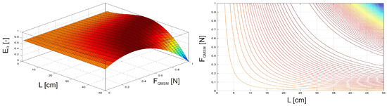 In the first two examples, the investigation focused on a damaged, clamped beam equipped with an MSM actuator. F(t) = sin(t) of the amplitude = 1 N and frequency = 5 Hz. The MSM actuator was excited with an amplitude = 0.35 N, a frequency = 5 Hz, a phase shift = 180° relative to the harmonic force F(t). The position of the MSM actuator and the damage position were varied along the length of the beam (Figure 9). Additionally, the intensity of the damage plasticity D was adjusted from 0 to 1 (Figure 10), where 1 indicates a fully broken beam.