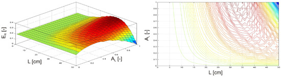 In the next two examples, the investigation focused on a damaged, clamped beam equipped with an MR damper subjected to an external harmonic force F(t) = sin(t) with an amplitude of FQ = 1 N and a frequency of fQ = 50 Hz. In the first scenario (Figure 11), the MR damper was attached to the free end of the beam, while the damage position LD was varied along the beam. Simultaneously, the activation level of the MR damper, AL, was adjusted from 0 (inactive) to 1 (fully activated). In the second scenario (Figure 12), the MR damper remained fully activated at the free end of the beam. At the same time the damage position LD was varied, and the intensity of the damage plasticity D was adjusted from 0 to 1, with 1 representing a fully broken beam.