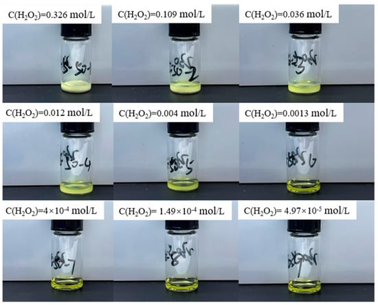 An amount of 4.85 g uranium nitrate hexahydrate was dissolved in the 10 mL 0.5 mol/L nitric acid to give 0.966 mol/L stock solution. Then, 1000, 333, 111, 37, and 12 μL of 30% hydrogen peroxide were diluted to 10 mL with a certain amount of deionized water in volumetric flasks, respectively. Hydrogen peroxide solutions with a concentration of 0.979, 0.326, 0.109, 0.036, and 0.012 mol/L were prepared. Next, 82, 27, and 9 μL of 30% hydrogen peroxide was diluted to 200 mL with a certain amount of deionized water in volumetric flasks, respectively. Hydrogen peroxide solutions with concentrations of 0.004, 0.0013 and 4.47 × 10−4 mol/L were prepared. Then, 9 μL of 30% hydrogen peroxide was diluted to 600 mL with a certain amount of deionized water to give a hydrogen peroxide solution with a concentration of 1.49 × 10−4 mol/L. An aliquot of 200 μL of stock solution was introduced into a glass reaction vessel. To the stock solution, 100 μL of hydrogen peroxide solutions of diverse concentrations were added. These reactions were conducted at ambient temperature, as well as at controlled temperatures of 50 °C and 80 °C in baking oven. The resultant final concentrations of hydrogen peroxide ranged from 0.326 mol/L, 0.109 mol/L, 0.036 mol/L, 0.012 mol/L, 0.004 mol/L, 0.0013 mol/L, 4 × 10−4 mol/L, 1.49 × 10−4 mol/L, to 4.97 × 10−5 mol/L. Each reaction solution was maintained at the respective temperature for a duration of four hours to facilitate reaction progression while observing the resultant chemical state in detail.