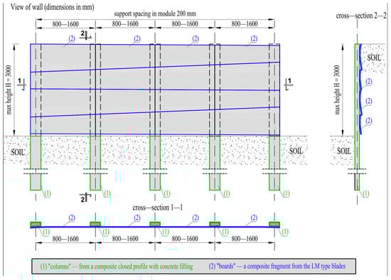 The concept of repurposing wind turbine blade waste for slopes and trench protection walls involves the use of two types of elements (Figure 1). These are vertical columnar elements obtained from Vestas-type blades and horizontal plate elements obtained from LM-type blades. The limited height of the wall above ground level is 3000 mm. The minimum foundation depth of the columns is determined by the stability and load-bearing capacity conditions and depends on soil conditions. The spacing of the supports is designed in the range of 800–1600 mm in a 200 mm module. Columns are designed from a closed composite profile obtained from Vestas-type blades. Columns with a maximum length of up to 6 m are inserted into the soil at least to the height of the wall, depending on soil conditions. The columns are designed with concrete filling. The boards are designed from the side walls of Vestas-type blades. The cross-sections of the boards have a slightly curved surface, obtained as wing fragments with dimensions of about 500 × (950–1750) mm.
