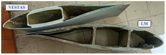 Samples prepared from wind turbine blades of the Vestas type: (a) filled with concrete; (b) not filled with concrete.