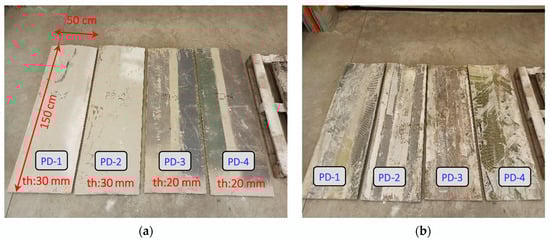 Prepared samples of “boards” from wind turbine blades of type LM: PD-1, PD-2, PD-3, and PD-4: (a) outer side of wind turbine blade; (b) inner side of wind turbine blade.
