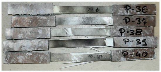 In the case of samples with a Vestas profile, the longitudinal tensile strength was characterized by high variability. Eight specimens, between 23 and 26 mm thick, taken from the top or bottom surfaces of the boxes failed within the strength machine mounts, while only one failed correctly in the center. The samples taken from the sides of the boxes, between 7 mm and 11 mm thick, all failed as recommended by the ASTM D3039/D3039M standard, shown in the photograph in Figure 8. Based on the Dixon test from the population surveyed, three outliers were rejected. The average longitudinal tensile strength of the Vestas-type elements obtained from the tests was only 297 MPa, with a standard deviation of 52.9 MPa.