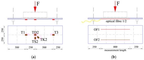 Distribution of RFSGs and optical fibers on LM profile samples PD-1, PD-2, PD-3, and PD-4: (a) scheme of distribution of RFSGs; (b) scheme of distribution of optical fibers.