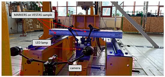 The use of the DIC ARAMIS 2D system to measure displacements required the appropriate preparation of the measured surface. The lateral surface of the test components was measured, which was clearly visible to the cameras of the ARAMIS system. On these surfaces, sticker markers were also used as measuring points (Figure 12).