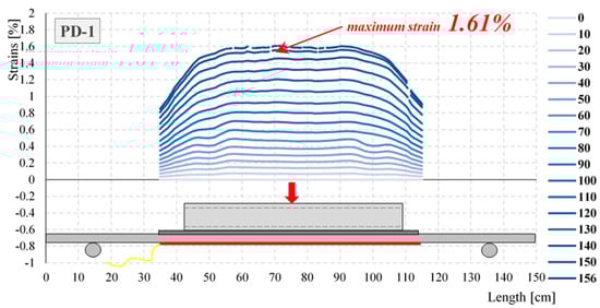 Figure 14 shows the strain distributions registered during the selected stage of the test for element PD-1, obtained from the optical fiber (OF). Extreme values were registered in the mid-span of the element. The maximum strain observed at a load of 156 kN was equal to 1.61% (16 100 με). The maximum strains of the elements PD-1, PD-2, PD-3, and PD-4, measured by the optical fibers (OF) for selected load stages, are summarized in Table 3.