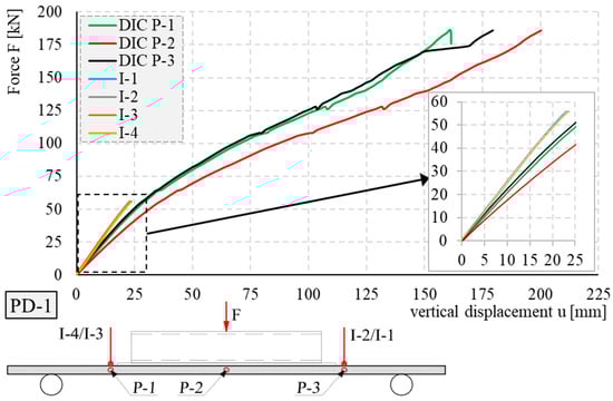 The displacement–force relationship for the PD-1 element obtained during the tests is shown in Figure 15. Displacements were measured using inductive sensors and the DIC system. When the pre-estimated displacements were exceeded, the inductive sensors were removed because of the possibility of damage to the measuring sensors by separating composite fibers.