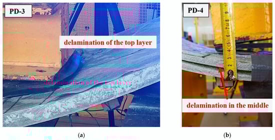 Both 30 mm thick boards (PD-1 and PD-2) showed significant agreement between the results obtained, i.e., the failure load, measured strains, and displacements. The situation was different for the 20 mm thick boards. The failure load for the PD-3 component was more than double that of PD-4. This phenomenon is also evident in the measured strains and displacements. The reason for this may be the different failure mechanisms of the PD-3 and PD-4 components, shown in Figure 16. In the PD-4 element, delamination occurred in the middle of the height, while in the PD-3 element, delamination occurred on the outer layer of the composite. The failure mechanism of the PD-1 and PD-2 boards was analogous to that of PD-3, i.e., due to delamination of the top layer of the element in the compression zone.