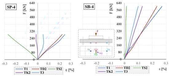 Analogous strain–force relationships were observed for all closed profiles tested. For the empty closed profiles (SP-1, SP-2, SP-3, and SP-4), strain gauges T1 and TD2 always showed the maximum longitudinal tensile strain, while strain gauge TS2 showed the maximum transverse compressive strain. Negative transverse strains in the TS2 gauges are the result of local deformation of the bottom surface of empty closed profiles. In contrast, in the concrete-filled elements, only the element with the smallest cross-section, SB-1, was measured with a negative transverse strain. In the other elements (SB-2, SB-3, and SB-4), the TS2 strain gauges indicated tensile strain.