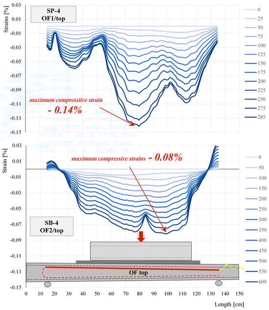 The strain distributions registered during the selected stage of the test for selected elements of the same cross-section—empty SP-4 and concrete-filled SB-4—obtained from the optical fibers (OFs) are shown in Figure 18 and Figure 19. The asymmetry of the strain distributions shown in Figure 18 and Figure 19 is due to the variable cross-section of the test closed profiles. The marked lack of symmetry observed during the tests along the bottom and top lines of the strain distributions shown in Figure 18 and Figure 19 is an indication of where damage is most likely to occur. Local variations in the strain distribution (local minima) observed in the hollow elements are caused by the curvature of the upper surface of the profile and the change in the load pattern during the tests. As a result of the deformation of the profile, the load pattern changes from initially linear to two-point.