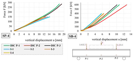 The displacement–force relationships for selected elements of the same cross-section—empty SP-4 and concrete-filled SB-4—obtained during the tests are shown in Figure 20. Analogous to the boards, the displacements were measured using inductive sensors and the DIC system.