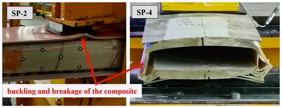 Two failure mechanisms were observed in the empty closed profiles. In elements SP-1 and SP-2, the failure was caused by the buckling of the compression chord of the box section. The authors of the publication [27] obtained an analogous failure mechanism for composite boxes of wind turbine blades. For elements SP-3 and SP-4, on the other hand, the failure was caused by delamination of the bottom chord at the support—as shown in Figure 21.