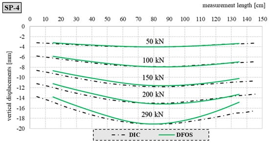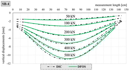 Similarly, Figure 24 shows a comparison of the deflection line obtained by the DIC and DFOS methods for the selected element filled with concrete, SB-4.