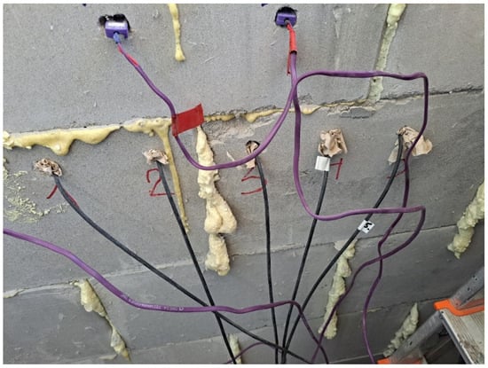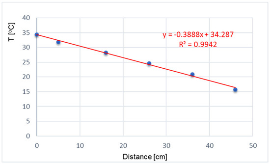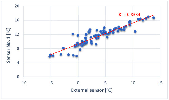 The course of temperature values recorded by the sensors inside the partition has a very strong linear correlation visible both in Figure 9 and in the graph presented in Figure 15. The correlation coefficient was calculated for the data presented in Figure 15 for inside temperature and for sensors no. 1 to 5. Outside temperature was omitted as an outlier. It is worth noting that the 2 cm layer of material between sensor no. 1 and the outer surface of the partition may not be as uniform as the remaining inner part of the partition, which may result from the action of external factors.