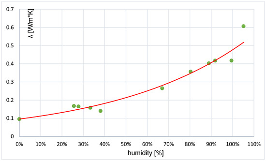 Tests of the thermal conductivity coefficient of a perlite concrete block in various humidity conditions were carried out using a portable ISOMET 2114 device equipped with a surface probe. The measurement results were used to create a graph depicting the influence of humidity on the value of the thermal conductivity coefficient. The graph curve has the form of a parabola and shows that the value of the thermal conductivity coefficient increases with increasing moisture content in the perlite concrete block (Figure 6). For the block in an air-dry state, the thermal conductivity coefficient λ is 0.0956 W/m·K, and for 50% humidity it is 0.215 W/m·K. This means that the value of the coefficient increases by more than twofold [31].
