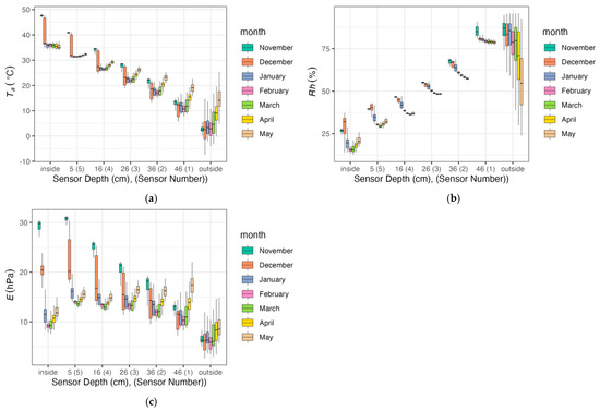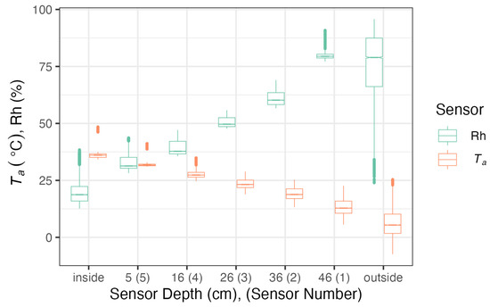 Temperatures and humidities were measured inside (in the middle, 30 cm below the ceiling), and outside (at 200 cm height) the research object, and inside the wall at assigned depths. Boxplots indicate the spread of temperature and humidity (boxes show the first and third quartile, whiskers show the largest/smallest values but do not extend beyond 1.5 times of the interquartile range, and outliers are shown as separate points).