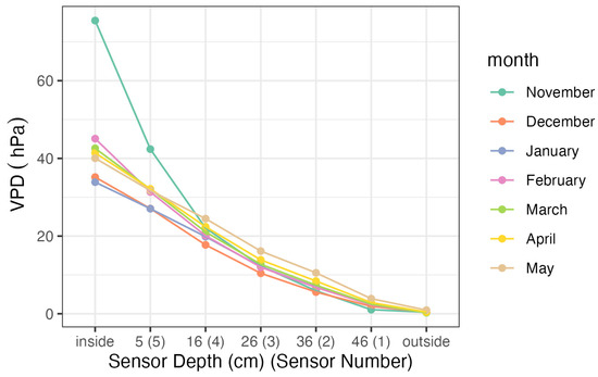 In order to investigate whether water vapour condensation could occur inside the partition at any time during the experiment, its vapour deficiency (VPD) was calculated. Conditions favouring condensation could appear during cold periods, and the possible accumulation of moisture and its condensation would be very undesirable also due to the deterioration of the thermal insulation properties of the tested material. The calculated minimum VPD values for individual sensors divided by months are shown in Figure 10 (condensation starts when VPD = 0). As it can be seen in the graph (Figure 10), the risk of condensation inside the material did not occur (even periodically) under the conditions of the experiment, which should be considered a valuable property of the tested material.
