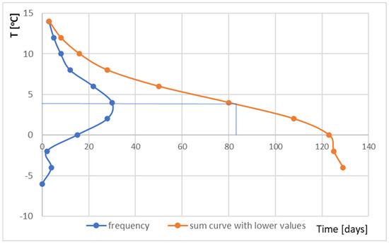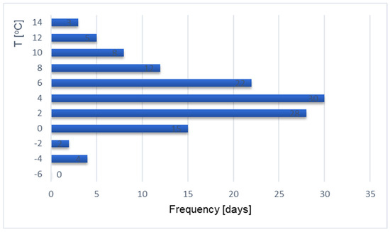 The research object shown in Figure 4 had dimensions of 143.0 × 200.0 × 190.0 cm, with 48 cm thick walls. It was closed with a double layer of 100 mm thick EPS polystyrene. Five sensors were placed in the partition at depths of 46 cm, 36 cm, 26 cm, 16 cm and 5 cm. The object was equipped with a humidifier maintaining the set humidity, a heater maintaining the temperature and a DT85 recorder. From 23 November to 8 December, once the heater was turned on, inside temperature remained at approx. 46 °C; then, it was reduced to 36 °C. From 30 May, inside temperature was 26 °C.