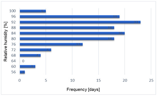 Before installation in the research object, the sensors were calibrated and the differences between readings from the relative humidity sensors were verified (Figure 5). For this purpose, the sensors were placed in a bottle through which air with known water vapour content was passed. To achieve stable water vapour concentration conditions, a LI-610 dew-point generator, Licor, was used.