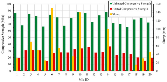 - The optimal mix maintained adequate workability (slump = 210 mm) for up to 3 h post-mixing. Its unheated compressive strength was comparable to the lab-scaled optimal mix, while its heated compressive strength (after 2 h at 600 °C) decreased from approximately 34 MPa to 23.5 MPa.