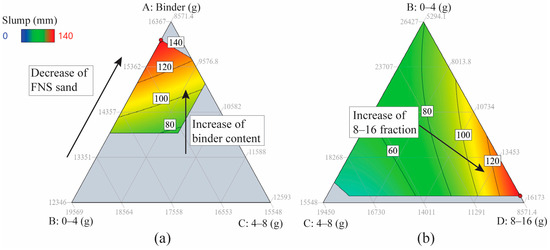 Figure 3 presents contour plots corresponding to the surfaces of the slump model outlined in Table 5. In each plot, the quantities of all components are scaled to a 60 kg concrete batch, with each side representing a specific component and progressing in a clockwise direction around the plot. Within each plot, three components are subject to variation, while the remaining two are held constant. The optimal concrete mix is located in the upper corner of both Figure 3a, suggesting that adjusting the original component limits to increase the binder content and decrease the aggregate fractions of 0–4 mm and 4-8 mm would likely enhance the concrete slump. This is expected as the reduction in the smaller-sized fraction would result in less aggregate surface area to cover and, therefore, an increase in the amount of paste free to facilitate the flow of the mix.