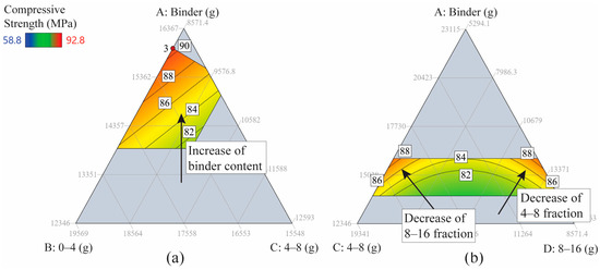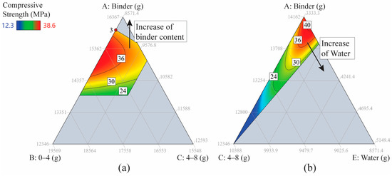 2D ternary contour plots for heated compressive strength as a function of three components: (a) A, B, C with fixed water and coarse aggregates 8–16 mm; (b) A, C, E with FNS sand and coarse aggregate 8–16 mm content fixed.