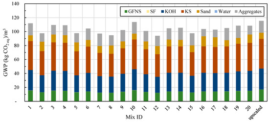 The global warming potential (GWP) of the optimal L-FNS-AAC mix was calculated to be 113.7 kg CO2_eq., while the upscaled mix resulted in 115.4 kg CO2_eq. The lowest emissions were observed for mix 12, which had a poor overall performance at 94 kg CO2_eq. per 1 m3 (Figure 7). In these calculations, only emissions from the ferronickel slag grinding process were considered, contributing approximately 14% to the total GWP of the mixes. The majority of emissions, 59% to 64%, were attributed to the activators (KOH and KS). The concentrations of chemical activators were varied within narrow limits, resulting in most mix designs producing similar levels of CO2-equivalent emissions.