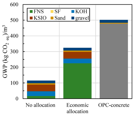 Impact of allocation method on total GWP of L-FNS-AAC (upscaled mix) compared to a strength-wise equivalent OPC-based concrete.